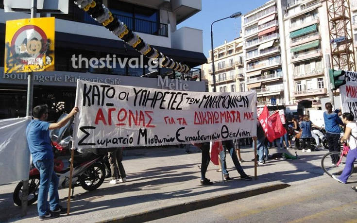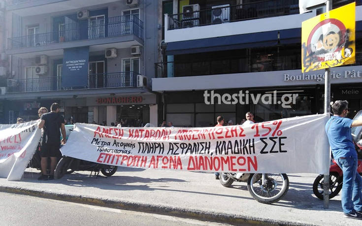 Διαμαρτυρία πραγματοποιούν αυτή την ώρα διανομείς στο κέντρο της Θεσσαλονίκης, στο πλαίσιο της 24ωρης απεργίας που έχει προκηρύξει για σήμερα η ΓΣΕΕ.