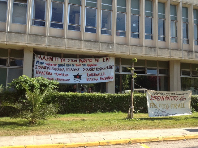 Πάνω από 30 Συλλογικές Κουζίνες και δομές Κοινωνικής Αλληλεγγύης από τις γειτονιές της Αθήνας μαγειρεύουν για τον κόσμο που έχει συγκεντρωθεί και σήμερα στο προαύλιο της ΕΡΤ.