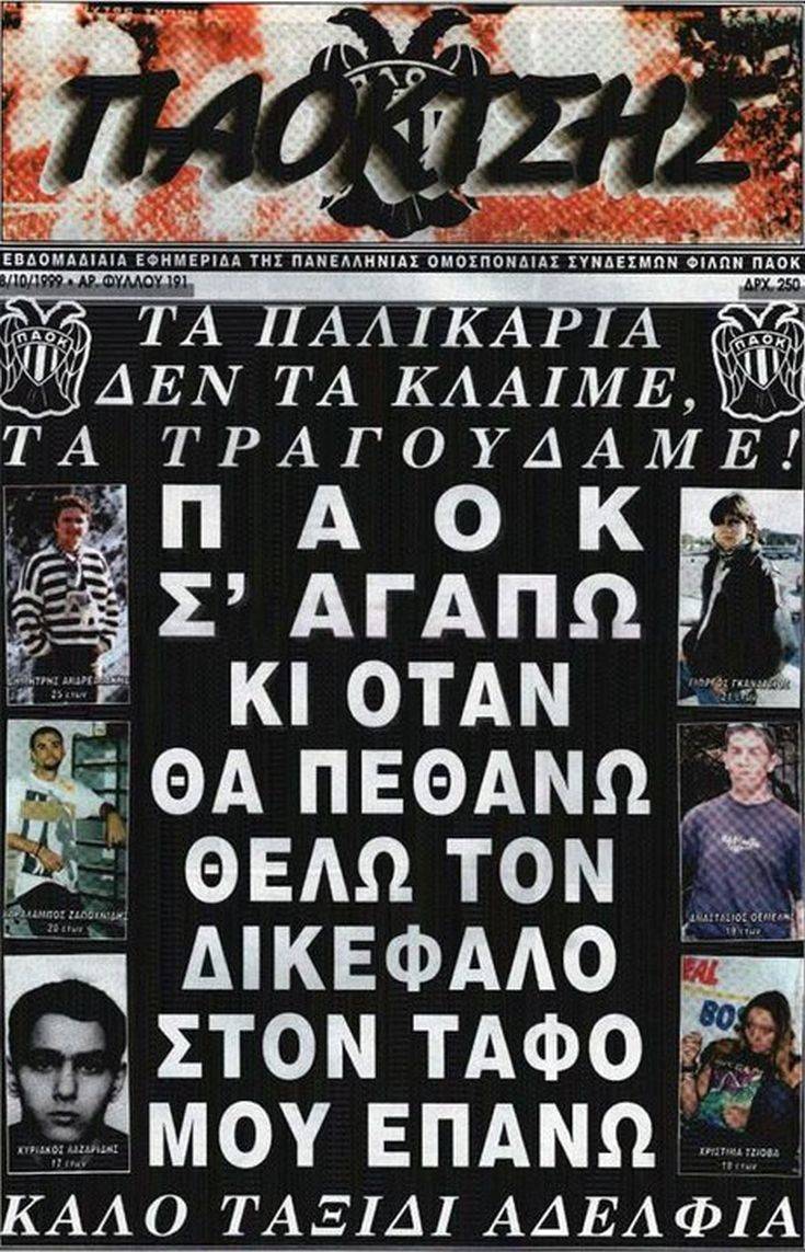 Ο «ΠΑΟΚΤΣΗΣ», η εβδομαδιαία εφημερίδα -ευαγγέλιο των οπαδών του «Δικεφάλου»- είχε φροντίσει να τρέξει να βρεις τις φωτογραφίες των έξι αδικοχαμένων παιδιών. Να τις βάλει στο ιστορικό πρωτοσέλιδό του, για να τους μάθει ο κόσμος και όπως εύστοχα έγραψε: «Τα παλικάρια δεν τα κλαίμε! Τα τραγουδάμε!».