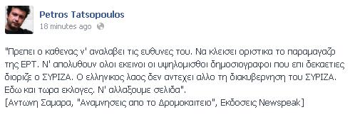«Πρέπει ο καθένας ν’ αναλάβει τις ευθύνες του. Να κλείσει οριστικά το παραμάγαζο της ΕΡΤ. Ν’ απολυθούν όλοι εκείνοι οι υψηλόμισθοι δημοσιογράφοι που επί δεκαετίες διόριζε ο ΣΥΡΙΖΑ. Ο ελληνικός λαός δεν αντέχει άλλο τη διακυβέρνηση του ΣΥΡΙΖΑ. Εδώ και τώρα εκλογές. Ν’ αλλάξουμε σελίδα.