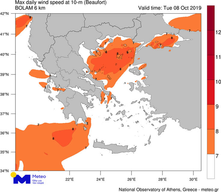 Παράλληλα, σημαντική ενίσχυση θα παρουσιάσουν οι βόρειοι άνεμοι στα ανατολικά, με την ένταση των ανέμων να φτάνει στο Αιγαίο τα 7 μποφόρ και στο Βορειοανατολικό Αιγαίο τα 8 μποφόρ, όπως εμφανίζεται στο Χάρτη 2. Εξασθένηση των θυελλωδών βοριάδων αναμένεται από τις απογευματινές ώρες της Τρίτης 08/10.