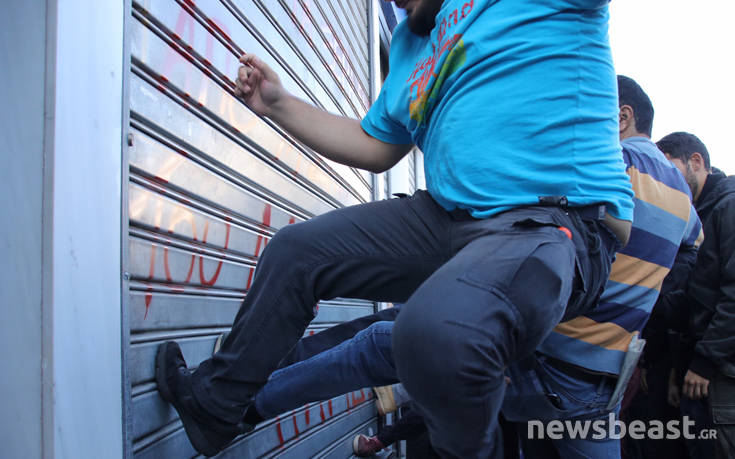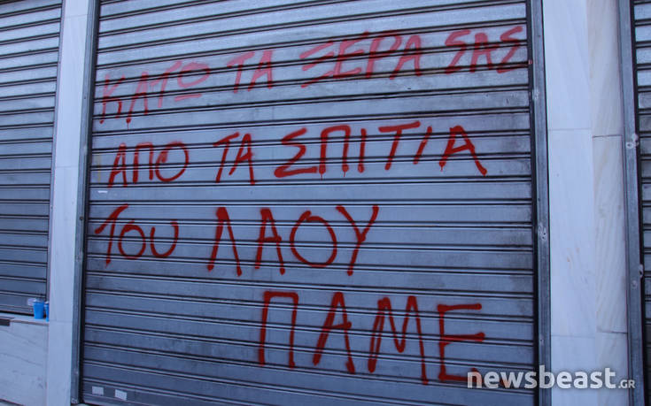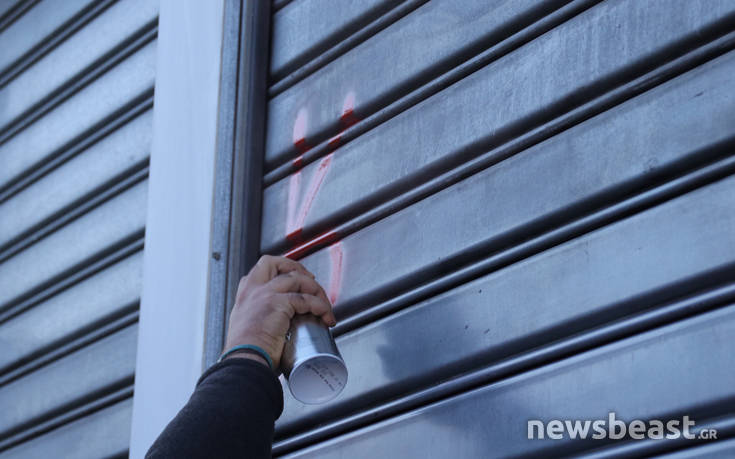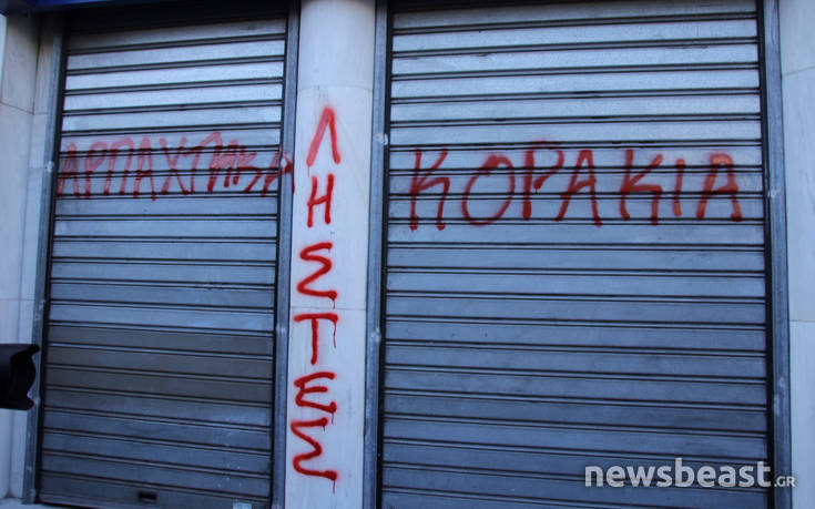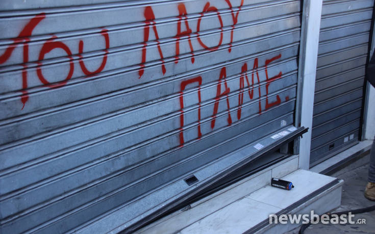 Πριν από λίγο διαδηλωτής έγραψε σύνθημα στα ρολά της τράπεζας ενώ λίγα λεπτά μετά και άλλοι διαδηλωτές κλώτσησαν και προσπάθησαν, ανεπιτυχώς, να σηκώσουν το προστατευτικό της τράπεζας χωρίς ωστόσο να δημιουργηθεί περαιτέρω ένταση.