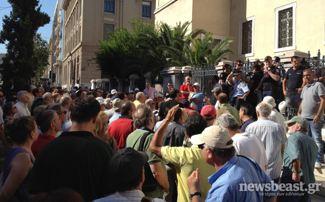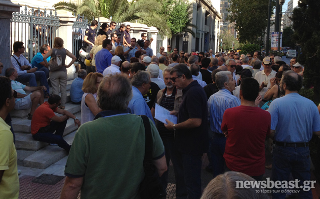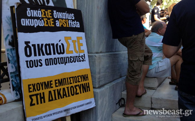 Περίπου 150 μικροοομολογιούχοι βρίσκονται έξω από το Συμβούλιο της Επικρατείας, στην Πανεπιστημίου, και διαμαρτύρονται μετά τις πληροφορίες που διέρρευσαν ότι το Δικαστήριο έκρινε συνταγματικό του κούρεμα των ομολόγων του Ελληνικού Δημοσίου, που έγινε το Μάρτιο του 2012.