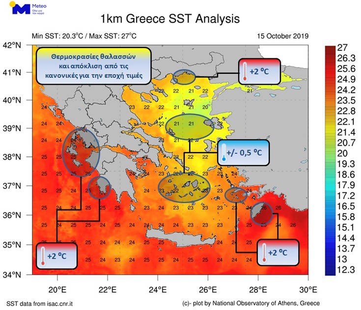 Όπως εξηγεί η μετεωρολογική υπηρεσία του Εθνικού Αστεροσκοπείου Αθηνών, αυτό έχει σαν αποτέλεσμα τα νερά να είναι πιο ζεστά του αναμενόμενου και να θυμίζουν Ιούνιο, ιδιαίτερα στο Ιόνιο, στα Δωδεκάνησα και στα βορειότερα τμήματα του Αιγαίου, όπου η απόκλισή (άνοδος) της θερμοκρασίας τους από τις κανονικές για την εποχή τιμές φθάνει τους δύο βαθμούς Κελσίου.