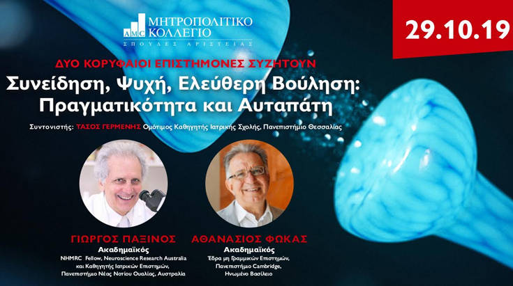Το Μητροπολιτικό Κολλέγιο έχει την τιμή να φιλοξενήσει δύο διεθνώς κορυφαίους Έλληνες επιστήμονες τον Ακαδημαϊκό κ. Γιώργο Παξινό (Πανεπιστήμιο Νέας Νοτίου Ουαλίας) και τον Ακαδημαϊκό κ. Αθανάσιο Φωκά (Πανεπιστήμιο Cambridge) σε μία ενδιαφέρουσα επιστημονική συζήτηση με θέμα: «Συνείδηση, Ψυχή, Ελεύθερη Βούληση: Πραγματικότητα και Αυταπάτη». Τη συζήτηση θα συντονίσει ο κ. Τάσος Γερμενής, Ομότιμος Καθηγητής της Ιατρικής Σχολής του Πανεπιστημίου Θεσσαλίας.