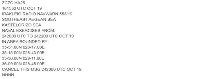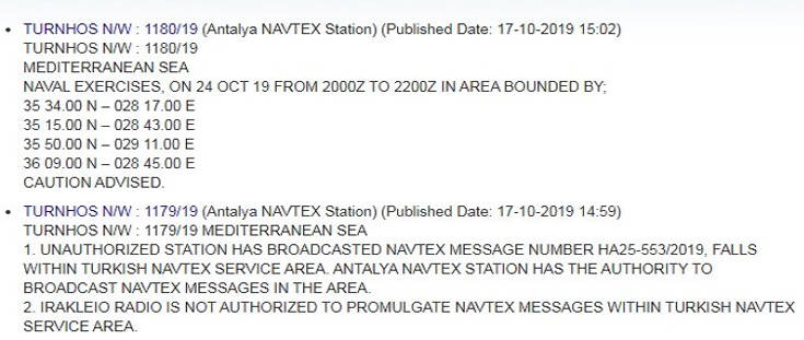 «Μη εξουσιοδοτημένος σταθμός εξέδωσε NAVTEX με τον αριθμό HA25-553/2019, η οποία πέφτει μέσα σε περιοχή τουρκικής υπηρεσίας NAVTEX. Ο σταθμός της Αττάλειας έχει την εξουσιοδότηση να εκπέμπει μηνύματα NAVTEX στην περιοχή. Ο σταθμός Ηράκλειο δεν είναι εξουσιοδοτημένος να εκδίδει μηνύματα NAVTEX μέσα σε περιοχή τουρκικής υπηρεσίας NAVTEX».