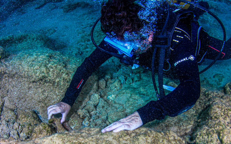 10. Η διευθύντρια της έρευνας Δρ Αγγελική Γ. Σίμωσι εξετάζει αρχαιότητες στον βυθό των Αντικυθήρων κατά την έρευνα Οκτωβρίου 2019.