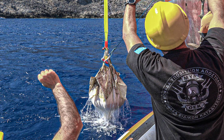5. Ανέλκυση σάκου με άμμο από την ανασκαφή στο ναυάγιο των Αντικυθήρων από το ερευνητικό πλοίο «ΤΥΦΩΝΑΣ», διακρίνονται η διευθύντρια της έρευνας Δρ Αγγελική Γ. Σίμωσι και ο επιχειρησιακά υπεύθυνος αρχιπλοίαρχος (ε.α.) Αλέξανδρος Παλατιανός