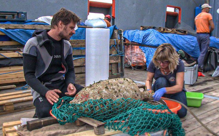 7. Αμφορέας από το φορτίο του ναυαγίου των Αντικυθήρων στο κατάστρωμα του ερευνητικού πλοίου «ΤΥΦΩΝΑΣ» δέχεται την φροντίδα της προϊσταμένης του τμήματος συντήρησης της Εφορείας Εναλίων Αρχαιοτήτων Χρύσας Φουσέκη και του Δρ Γεώργιου Κουτσουφλάκη.
