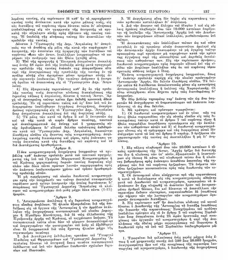 Ειδικότερα στο κεφάλαιο Ζ και στα άρθρα 27,28,29,30,31 και 32 που αναφέρονται στους κινηματογράφους δεν υπάρχει πουθενά αναφορά στο αν απαγορεύεται ή επιτρέπεται σε ανήλικους να μπαίνουν σε κινηματογράφους.