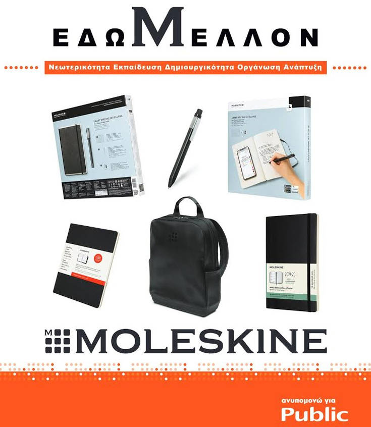 Έως 31 Οκτωβρίου, σε επιλεγμένα 10 καταστήματα του Public, σας περιμένουν ειδικά διαμορφωμένοι χώροι Moleskine, οι οποίοι θα φέρουν τη σήμανση «Εδώ Μέλλον» και θα έχουν όλα τα προϊόντα Moleskine, για να μπορεί να βρει ο καθένας αυτό που του ταιριάζει ανάλογα με τη δουλειά του και την καθημερινότητά του.