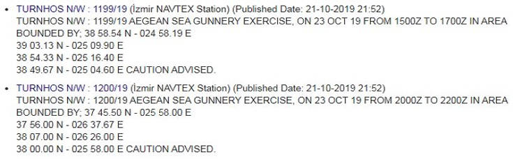 Στο πλαίσιο αυτό εξέδωσε σήμερα τρεις παράνομες και μία εξωφρενική… NAVTEX, σύμφωνα με το news.gr. Με τις τρεις παράνομες προσπαθεί να «καπελώσει» αντίστοιχες περιοχές που έχουν δεσμευθεί από τις ελληνικές Αρχές για ασκήσεις των ελληνικών ενόπλων δυνάμεων σήμερα, αύριο και στις 30 Οκτωβρίου.