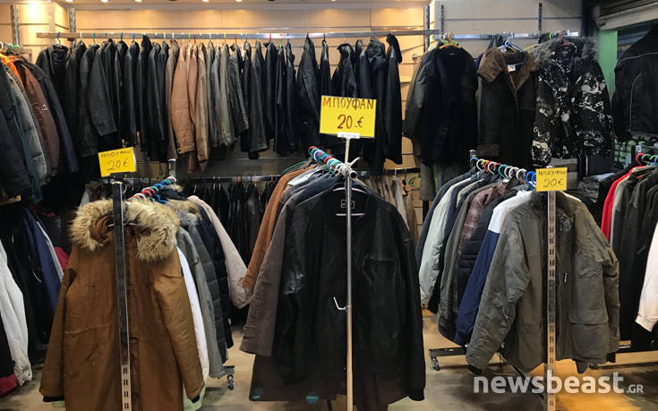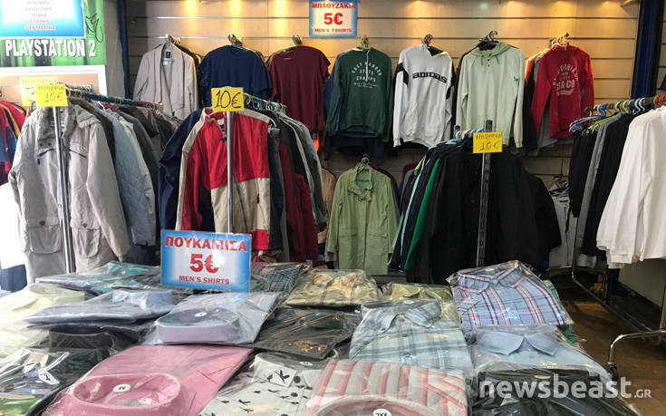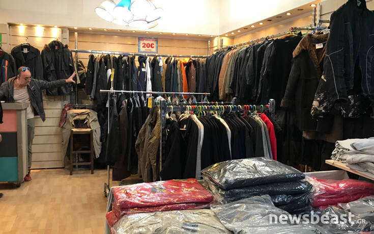 Καταστήματα που πωλούν ρούχα από εταιρίες που κλείνουν ή προϊόντα εισαγωγής από δεύτερο χέρι, συνεχίζουν να «ανθούν» στο κέντρο της Αθήνας. Δερμάτινα, μπουφάν, τσάντες, πωλούνται μόλις 10 ευρώ.