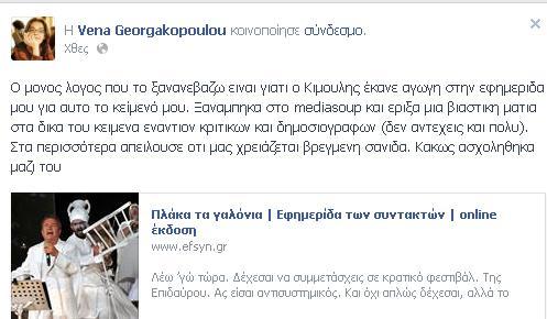 Η γνωστή δημοσιογράφος του πολιτιστικού ρεπορτάζ Βένα Γεωργακοπούλου γνωστοποίησε την αγωγή μέσω του προφίλ της στο Facebook και δημοσίευσε για μία ακόμη φορά το κείμενό της που φέρει τον τίτλο «Πλάκα τα γαλόνια». Το κείμενό της μάλιστα συνοδευόταν από φωτογραφία του γνωστού ηθοποιού με τον Αντώνη Σαμαρά και τον Βαγγέλη Μεϊμαράκη.