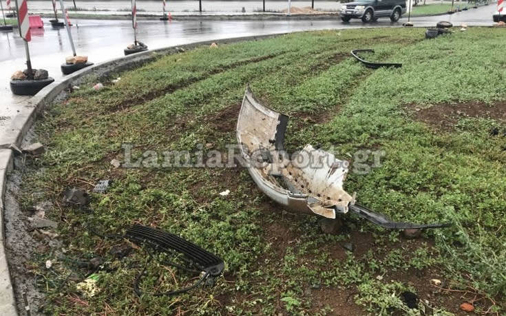 Αρχικά χτύπησε πάνω σε κάποιες από τις πινακίδες και στη συνέχεια «καβάλησε» τον κόμβο περνώντας από πάνω με αποτέλεσμα να αφήσει προφυλακτήρα και άλλα εξαρτήματα στο σημείο.