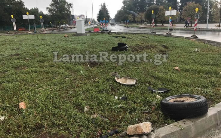 Το αυτοκίνητο έπεσε με ταχύτητα πάνω στον κόμβο αφού έσπασε το κράσπεδο και κατέληξε στην απέναντι πλευρά του κόμβου.
