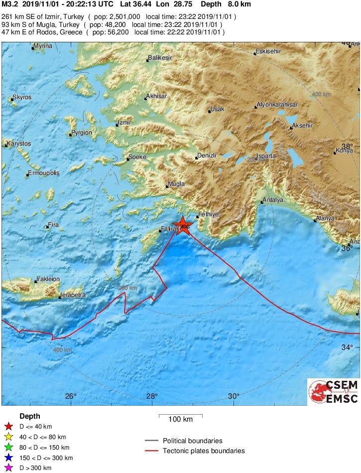 Σύμφωνα με το Ευρωμεσογειακό Ινστιτούτο ο σεισμός είχε εστιακό βάθος 8 χιλιόμετρα και το επίκεντρό του εντοπίστηκε 36 χιλιόμετρα βόρεια της Ρόδου κοντά στις ακτές της Τουρκίας.