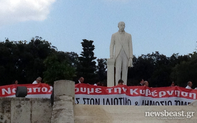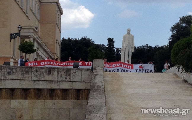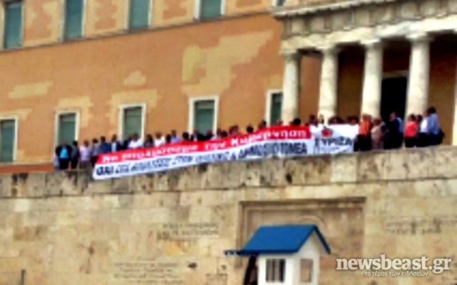 Οι βουλευτές έχουν μαζί τους πανό στο οποίο αναγράφεται «Να απολύσουμε την κυβέρνηση».