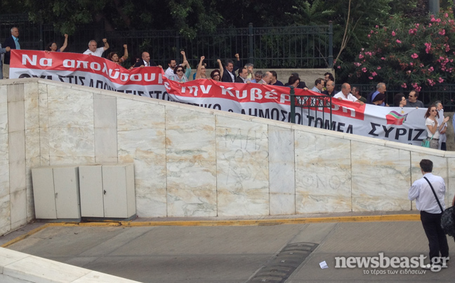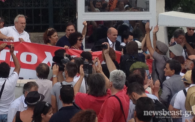 Με τον κόσμο ενώθηκαν μέλη της ΚΟ του ΣΥΡΙΖΑ που βρίσκονταν στο κοινοβούλιο, όπου βρίσκεται σε εξέλιξη η συζήτηση του πολυνομοσχεδίου.
