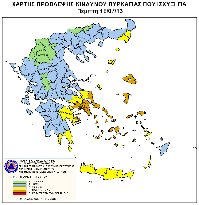 Πολύ υψηλός είναι και σήμερα ο κίνδυνος εκδήλωσης πυρκαγιάς σε αρκετές περιοχές της χώρας, σύμφωνα με το Χάρτη Πρόβλεψης Κινδύνου Πυρκαγιάς που εκδίδει η Γενική Γραμματεία Πολιτικής Προστασίας.