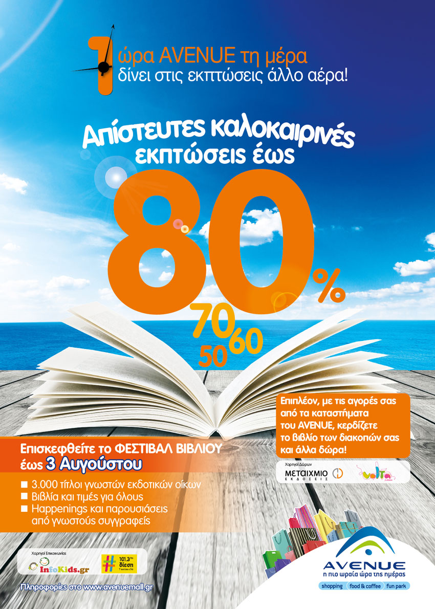 Για να ευχαριστήσει τους πελάτες του, το Εμπορικό Κέντρο Avenue, με αγορές μόνο 50 ευρώ από τα καταστήματα του Avenue, προσκομίζοντας τις αποδείξεις τους στην υποδοχή του Εμπορικού, όλοι μπορούν να συμμετάσχουν σε κλήρωση που θα γίνει στις 5/8/13 στο Avenue, για να κερδίσουν το βιβλίο που θα τους συντροφέψει στις διακοπές τους και όχι μόνο…