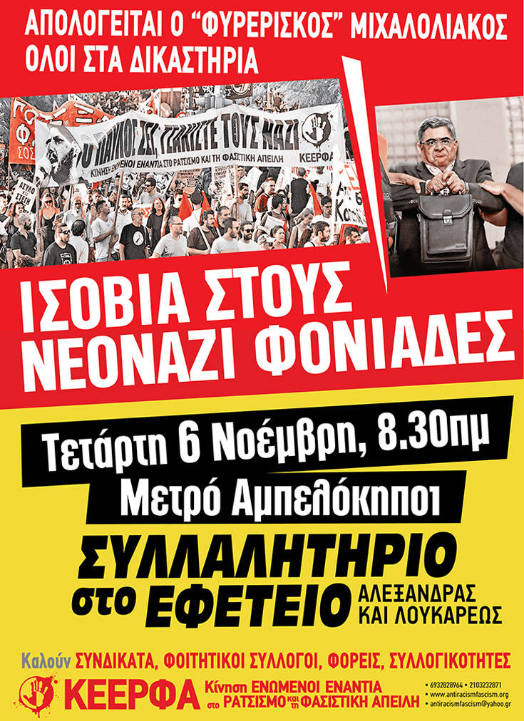 Με σύνθημα «Ισόβια στους Νεοναζί φονιάδες» το ΚΕΕΡΦΑ καλεί σήμερα σε αντιφασιστικές συγκεντρώσεις, με αφορμή τη σημερινή απολογία του αρχηγού της Χρυσής Αυγής Νίκου Μιχαλολιάκου.