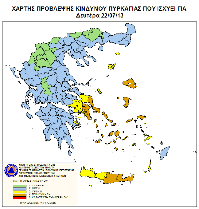 Πολύ υψηλός είναι σήμερα ο κίνδυνος εκδήλωσης πυρκαγιάς σε πολλές περιοχές της χώρας. Σύμφωνα με τον Χάρτη Πρόβλεψης Κινδύνου Πυρκαγιάς που εκδίδει η Γενική Γραμματεία Πολιτικής Προστασίας, για σήμερα προβλέπεται πολύ υψηλός κίνδυνος πυρκαγιάς (κατηγορία κινδύνου 4) για τις περιοχές: