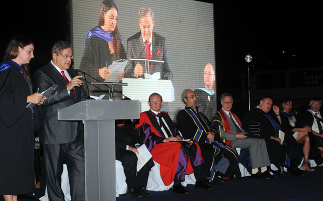 Χαιρετισμός του Προέδρου του New York College κ. Ηλία Φούτση προς τους αποφοίτους του Κολλεγίου. Στη σκηνή βρίσκονται ο Πρύτανης του University of Bolton Dr. George Holmes, ο Πρύτανης του New York College Διονύσης Μετζενιώτης, ο Αντιπρύτανης του University of Greenwich, Prof. Simon Jarvis, ο Dr. Hugh Hammett, Αντιπρόεδρος Εξωτερικών Υποθέσεων του State University of New York, ESC, καθώς και άλλα υψηλόβαθμα στελέχη των συνεργαζομένων πανεπιστημίων του Κολλεγίου.
