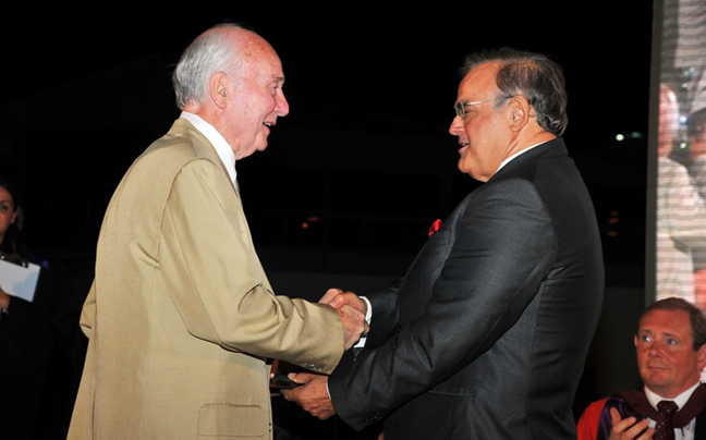 Ο Πρόεδρος του New York College κ. Ηλίας Φούτσης βραβεύει τον τ. Πρόεδρο του Αμερικανικού Κολλεγίου Ελλάδος έπη 34 χρόνια Dr. John S. Bailey, για την συνεισφορά του στον τομέα της Αμερικανικής ανωτέρας εκπαίδευσης στην Ελλάδα.