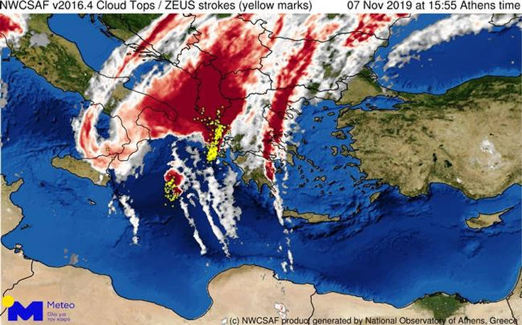 Στη δορυφορική εικόνα που ακολουθεί απεικονίζεται το μέτωπο και με κίτρινους σταυρούς οι περιοχές όπου σύμφωνα με το σύστημα ανίχνευσης κεραυνών «ΖΕΥΣ» εκδηλώνονται καταιγίδες στις 16:00 ώρα Ελλάδας.