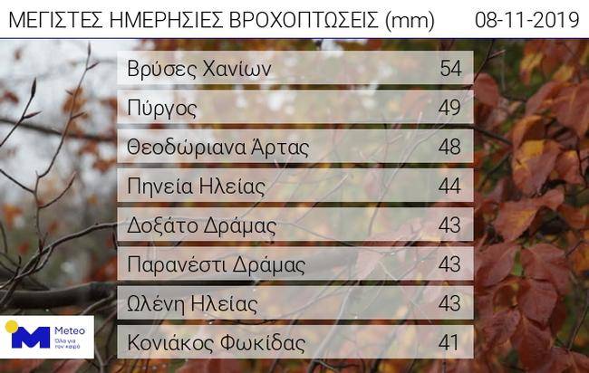 Τα μεγαλύτερα ύψη βροχόπτωσης που καταγράφηκαν από το δίκτυο αυτόματων μετεωρολογικών σταθμών του Εθνικού Αστεροσκοπείου Αθηνών/meteo.gr έως τις 10:00 σήμερα, ήσαν στις Βρύσες Χανίων (54 χιλιοστά), στον Πύργο (49) και στα Θεοδώριανα Άρτας (48).