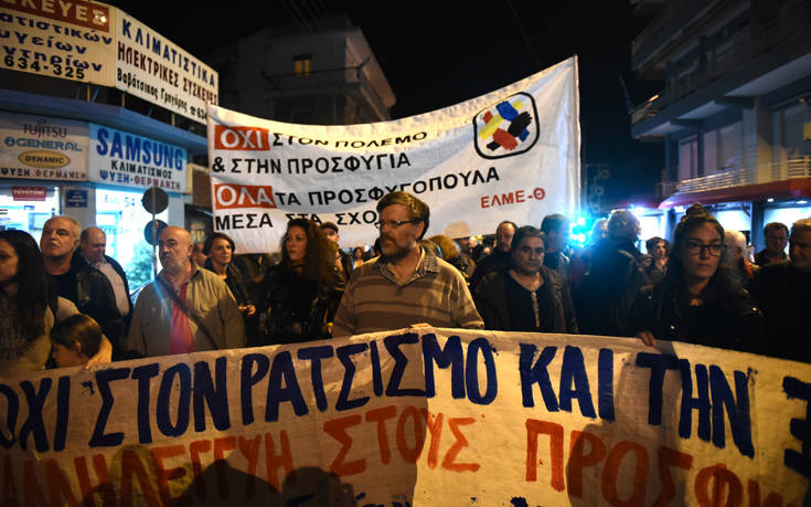 Οι διαδηλωτές κατήγγειλαν τα κρούσματα βίας, εκφοβισμού και επιθέσεων σε βάρος προσφύγων και μεταναστών και ζήτησαν «ανοιχτά σχολεία» για τα παιδιά τους.