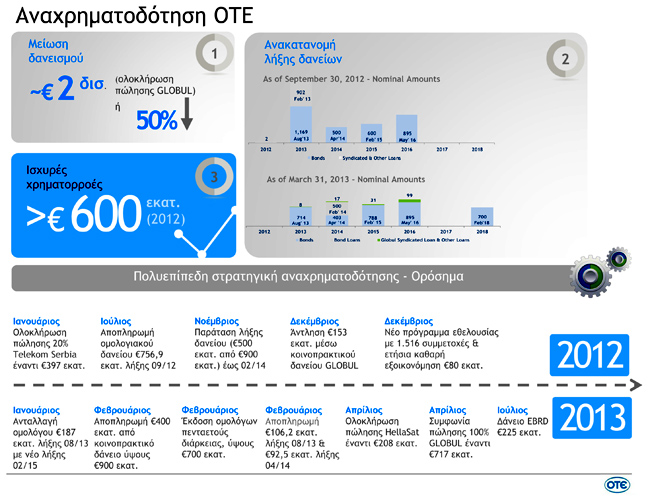 Η COSMOTE Ρουμανίας θα λάβει €75 εκατ. απευθείας από την Ευρωπαϊκή Τράπεζα Ανασυγκρότησης και Ανάπτυξης και €150 εκατ. μέσω κοινοπρακτικού δανείου στο οποίο συμμετέχουν διάφορες εμπορικές τράπεζες. Το δάνειο λήγει τον Απρίλιο του 2018.