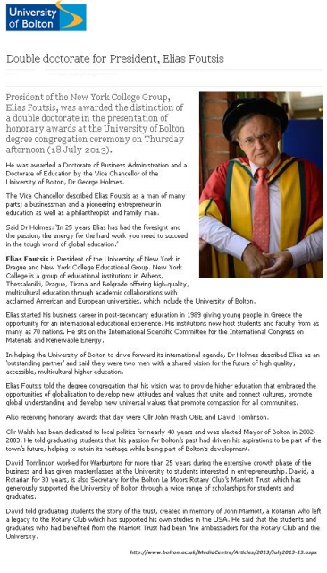 Ο Πρόεδρος του New York College κ. Ηλίας Φούτσης, αναγορεύτηκε επίτιμος διδάκτωρ του Πανεπιστημίου του Bolton λαμβάνοντας δυο διδακτορικούς τίτλους στη τελετή αποφοίτησης του University of Bolton στις 18 Ιουλίου.