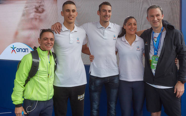 O αναβάτης, Βαγγέλης Κρητικός, οι OPAP Champions Αλέξης Ιωακειμίδης, Παναγιώτης Τριβυζάς, Δέσποινα Γεωργιάδου και ο Ντάμιαν Κόοουπ, Διευθύνων Σύμβουλος ΟΠΑΠ