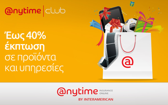 Τώρα η Anytime, μέσω του Anytime club, προσφέρει σε όλους τους ασφαλισμένους της προνομιακές εκπτώσεις σε υπηρεσίες και προϊόντα, καθώς και έξυπνες προτάσεις αγορών. Εξασφαλίζει εκπτώσεις σε ρούχα, είδη για το σπίτι, προτάσεις διασκέδασης και πολλά άλλα, σε συνεργασία με πολλές επώνυμες εταιρίες στην Ελλάδα. Επιπλέον, θα διοργανώνει συχνά διαγωνισμούς με πλούσια δώρα, ειδικά για τα μέλη του Anytime club!