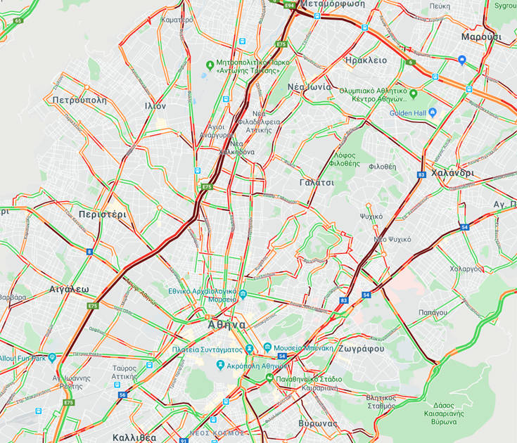 Στο «κόκκινο» είναι η κίνηση σε πολλούς δρόμους της Αθήνας
