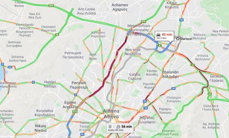 Δυτική Περιφερειακή Υμηττού καθυστερήσεις 15΄-20΄ ύψος Παπάγου- Χολαργού έως Κηφισίας προς Ελευσίνα.