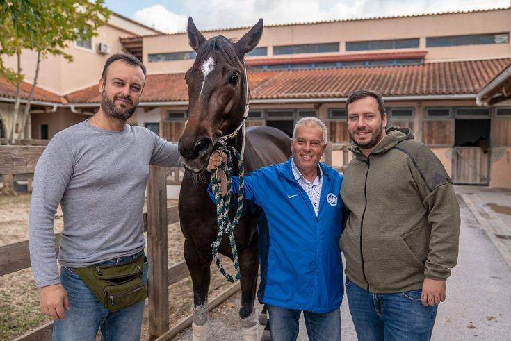 Οι συνιδιοκτήτες του ίππου ΡΕΒΑΜΠ Χρήστος Αργυρόπουλος και Ανδρέας Ζυγόπουλος, με τον προπονητή Νίκο Καλογερόπουλο.