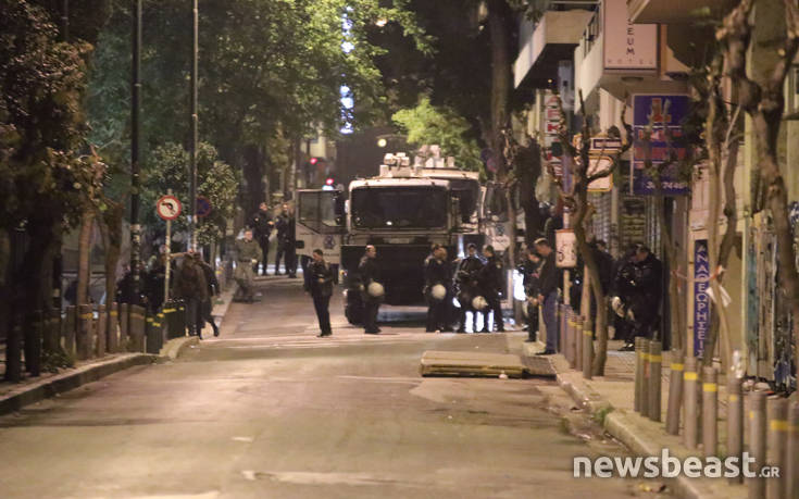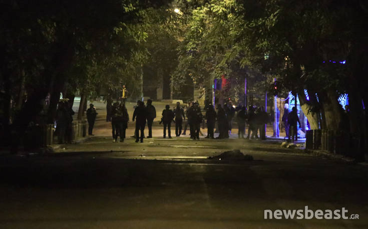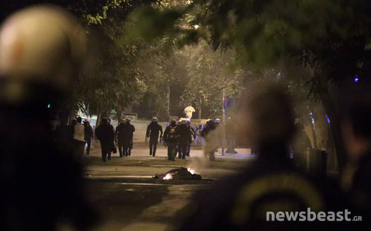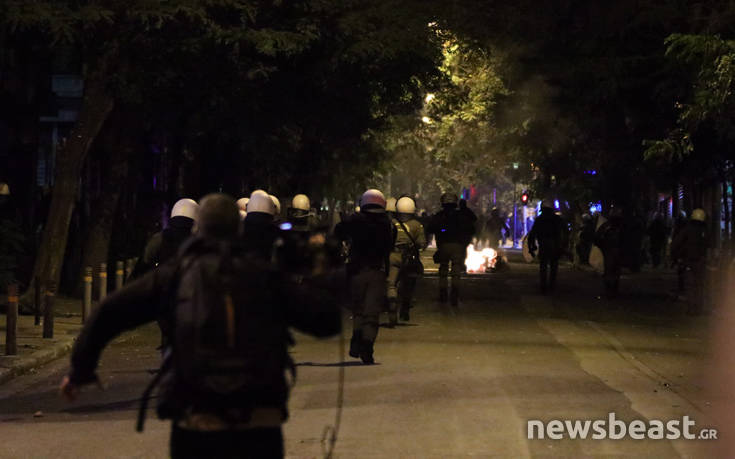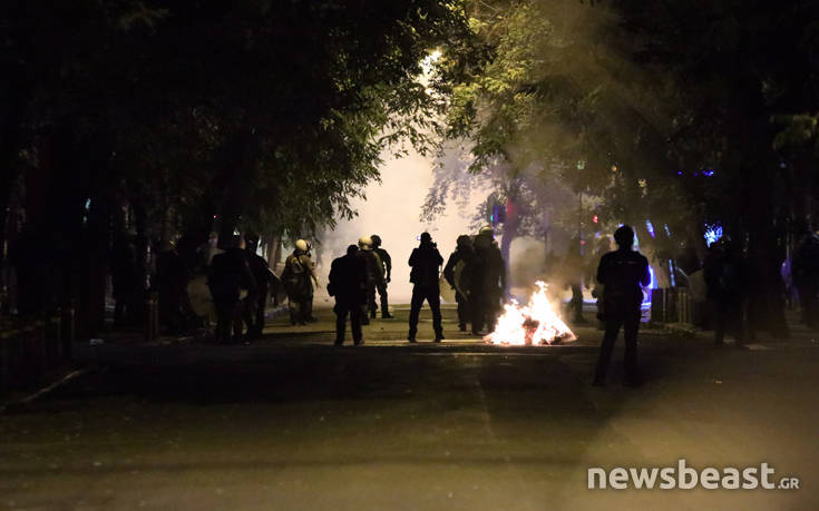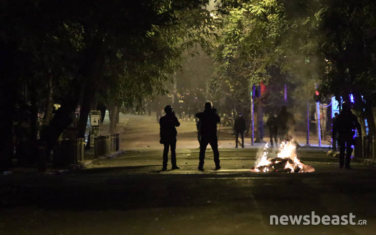 Λίγο αργότερα, οι αντιεξουσιαστές άναψαν φωτιές στο οδόφραγμα στην οδό Στουρνάρη και αστυνομικοί των ΜΑΤ ξεκίνησαν να τους κυνηγούν. Νωρίτερα, η αστυνομία είχε κάνει ντου σε κτίρια στα Εξάρχεια ενώ 6 άτομα συνελήφθησαν.
