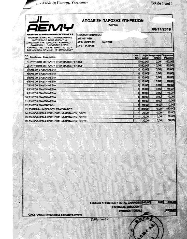 Στη συνέχεια προστίθεται: «Σας κοινοποιούμε τιμολόγια που είναι “τσουχτερά” στην κυριολεξία. Αξονική που στοιχίζει 74 ευρώ με το κρατικό τιμολόγιο, χρεώνεται 200 ευρώ, συρραφή τραύματος με τιμή χειρουργικής επέμβασης, αιματολογικές εξετάσεις 30 ευρώ αντί 3 ευρώ!!!