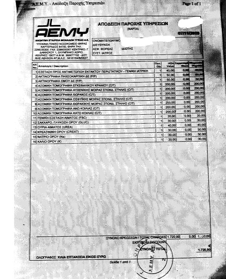 Οι εξετάσεις του εν λόγω ασθενή που σας κοινοποιούμε είναι 2.360 ευρώ».