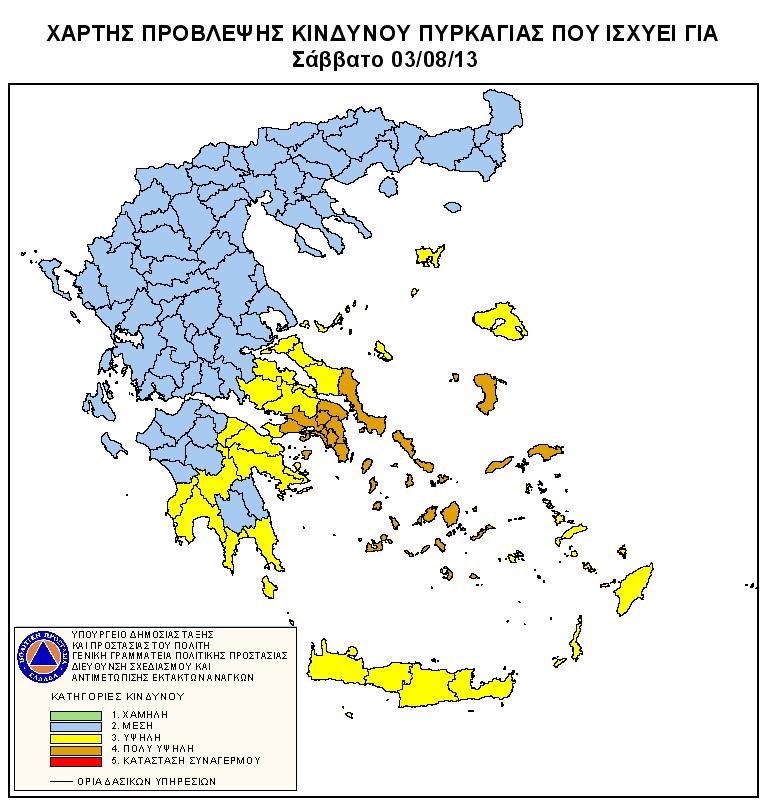Πολύ υψηλός είναι σήμερα ο κίνδυνος εκδήλωσης πυρκαγιάς σε αρκετές περιοχές της χώρας. Σύμφωνα με το Χάρτη Πρόβλεψης Κινδύνου Πυρκαγιάς που εκδίδει η Γενική Γραμματεία Πολιτικής Προστασίας για σήμερα Σάββατο 3 Αυγούστου 2013, προβλέπεται πολύ υψηλός κίνδυνος πυρκαγιάς (κατηγορία κινδύνου 4) για τις εξής περιοχές: