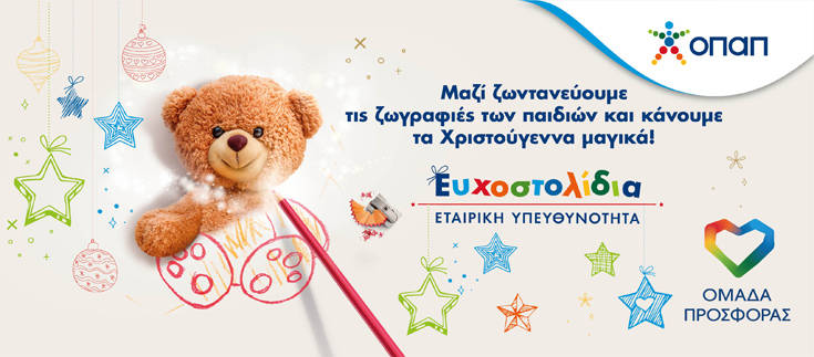 Το πνεύμα των Χριστουγέννων εφέτος έρχεται νωρίτερα μέσα από την πρωτοβουλία Ευχοστολίδια, με στόχο όλοι μαζί να προσφέρουμε σε χιλιάδες παιδιά που έχουν ανάγκη και να εκπληρώσουμε τις ευχές τους έως το τέλος του έτους. Ο ΟΠΑΠ, στο πλαίσιο της μεγάλης γιορτής προσφοράς και αγάπης που πραγματοποιεί για έκτη συνεχή χρονιά, μας καλεί όλους να επιλέξουμε τα Ευχοστολίδια για να κάνουμε πραγματικότητα τις ζωγραφιές–χριστουγεννιάτικες ευχές των παιδιών από τον Οργανισμό «Το Χαμόγελο του Παιδιού», την Ένωση «Μαζί για το Παιδί», τα Παιδικά Χωριά SOS και το Ίδρυμα Γεωργίου και Αικατερίνης Χατζηκώνστα.