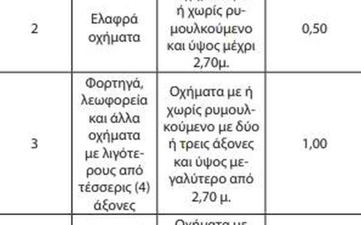 Οι τιμές ανά κατηγορία οχήματος είναι οι εξής: