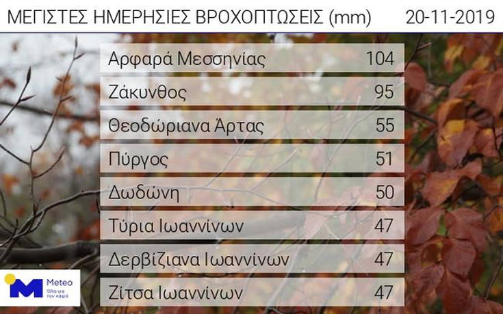 Στον πίνακα που ακολουθεί αναγράφονται οι 8 μεγαλύτερες καταγραφές βροχόπτωσης έως τις 10:00 το πρωί της Τετάρτης 20/11, σύμφωνα με το δίκτυο αυτόματων μετεωρολογικών σταθμών του Εθνικού Αστεροσκοπείου Αθηνών / meteo.gr.