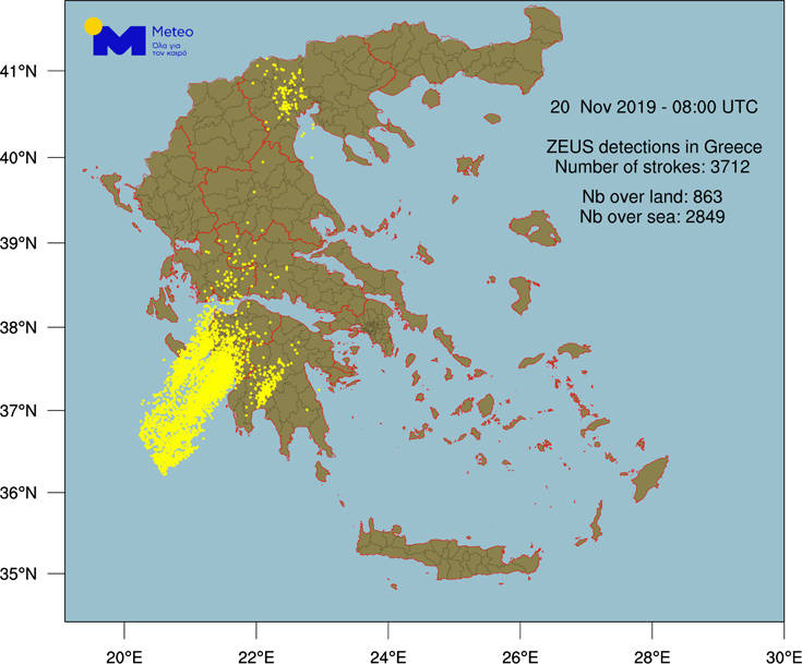 Παράλληλα, όπως φαίνεται στο χάρτη που ακολουθεί, σύμφωνα με το σύστημα ανίχνευσης κεραυνών «ΖΕΥΣ», μέχρι τις 10:00 το πρωί έχουν καταγραφεί 3.700 κεραυνοί εντός της Ελληνικής επικράτειας.