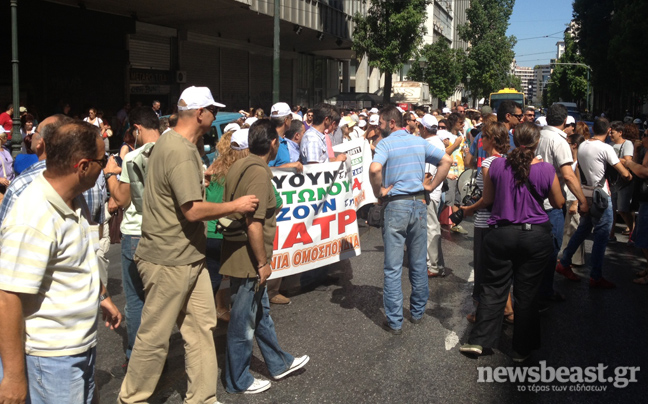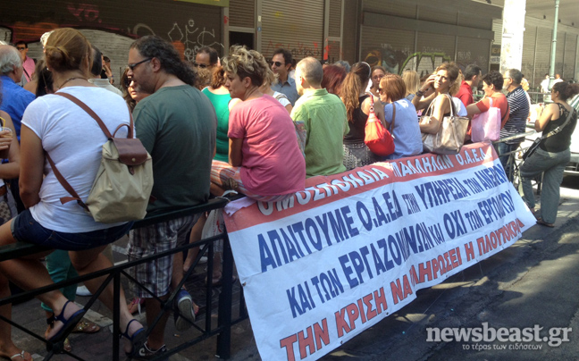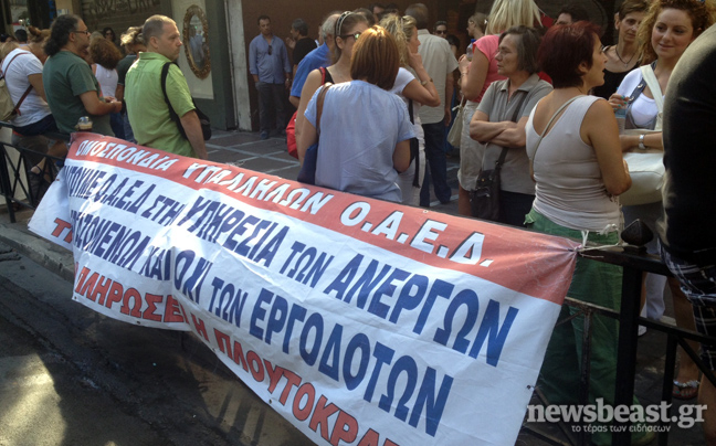 Εργαζόμενοι στον ΟΑΕΔ και στον τομέα της Κοινωνικής Ασφάλισης έχουν συγκεντρωθεί έξω από το υπουργείο Εργασίας που βρίσκεται επί της οδού Σταδίου.