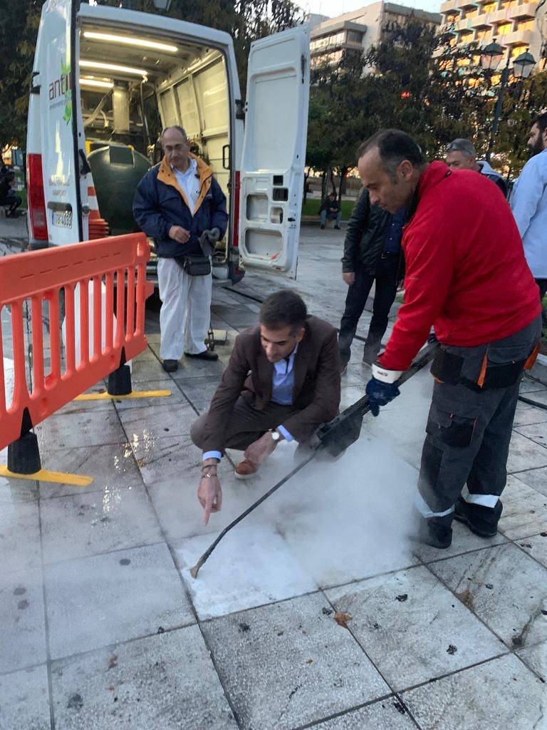 Πρόκειται για μια συντονισμένη προσπάθεια καθαρισμού και ταυτόχρονα απολύμανσης της Πλατείας Συντάγματος. Μάλιστα αυτή τη φορά γίνεται για πρώτη φορά με τον πλέον οικολογικό τρόπο και με τη συνδυασμένη χρήση ζεστού νερού μεγάλης πίεσης και ατμού.