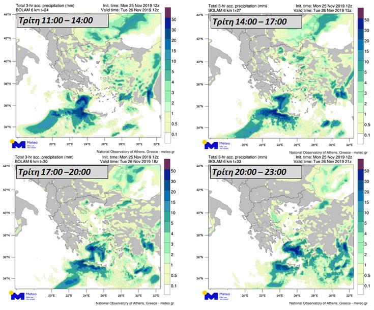 Κατά την τρίτη φάση του «Γηρυόνη», η οποία αναμένεται να διαρκέσει έως και τις πρώτες ώρες της Τετάρτης, βροχές και καταιγίδες αναμένεται να σημειωθούν κατά κύριο λόγο στο Αιγαίο στο Νότιο Ιόνιο, στη Νότια Πελοπόννησο και στην Κρήτη.